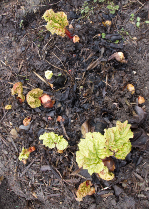 There are new shoots on the rhubarb; beautiful splashes of green and red.