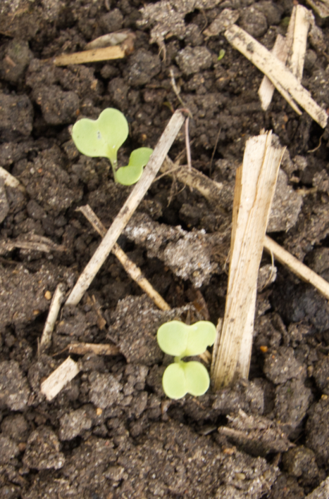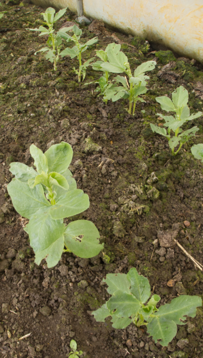 Within the polys, parsley and broad beans are making progress (with some holes in the leaves), while salad leaves and spring onions are peeping through the soil.