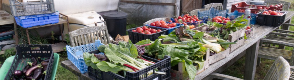 A bumper crop of tomatoes, cucumbers, marrows, chard, aubergine, beans (Cobra and Borlotta), beetroot, turnip, sweetcorn, basil, spring onions and raspberries.