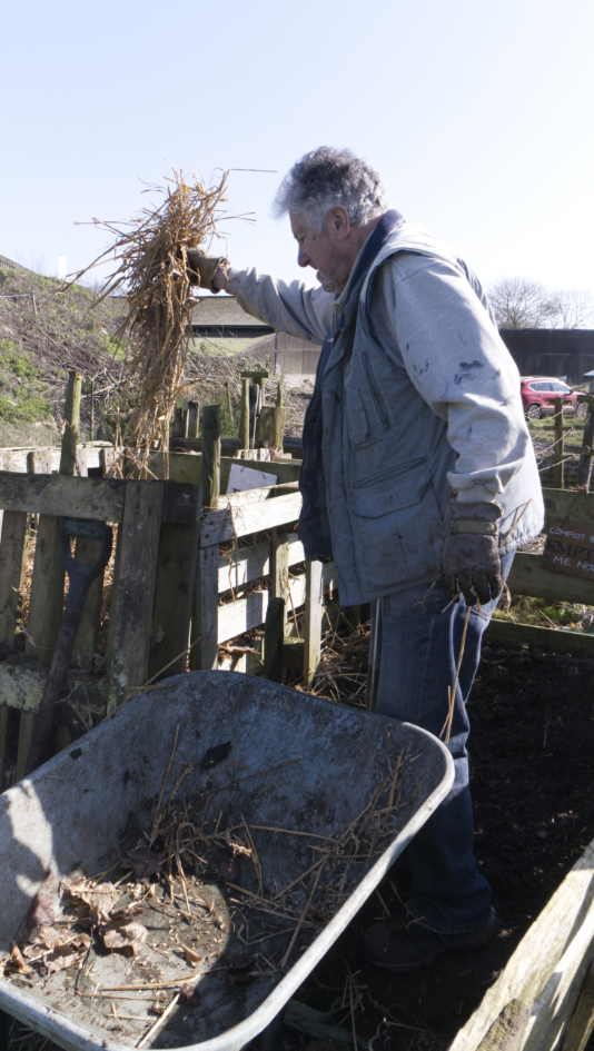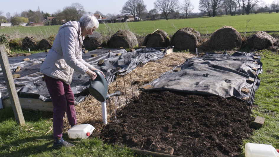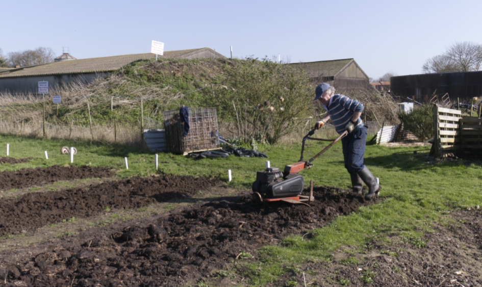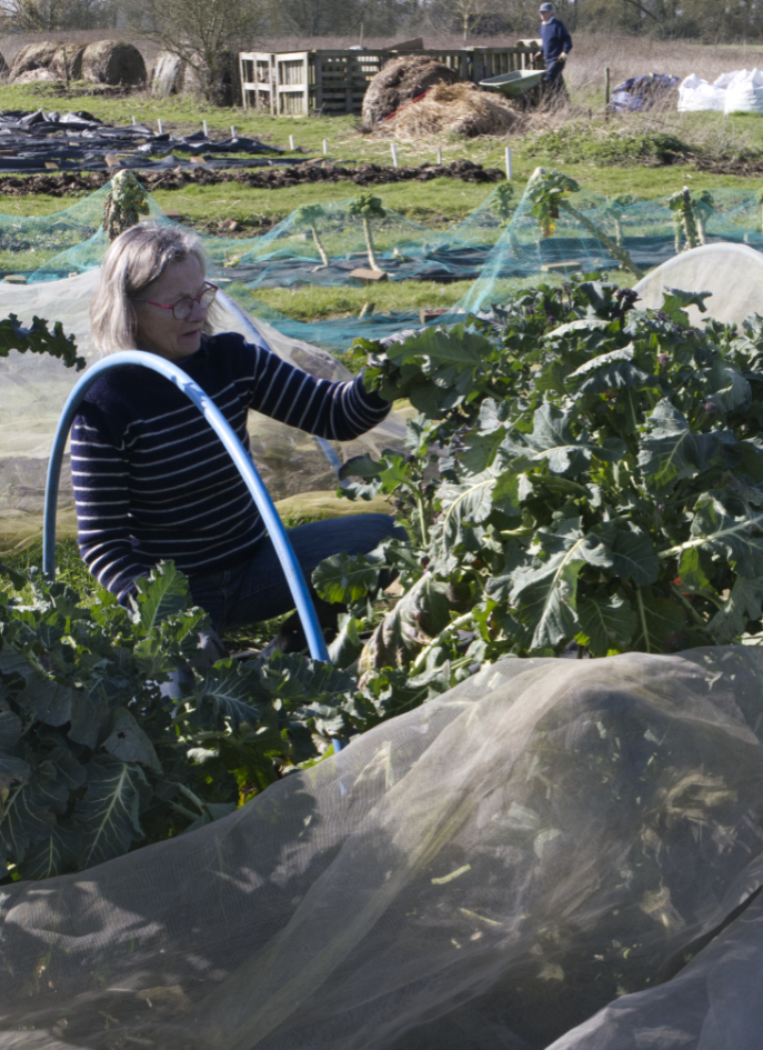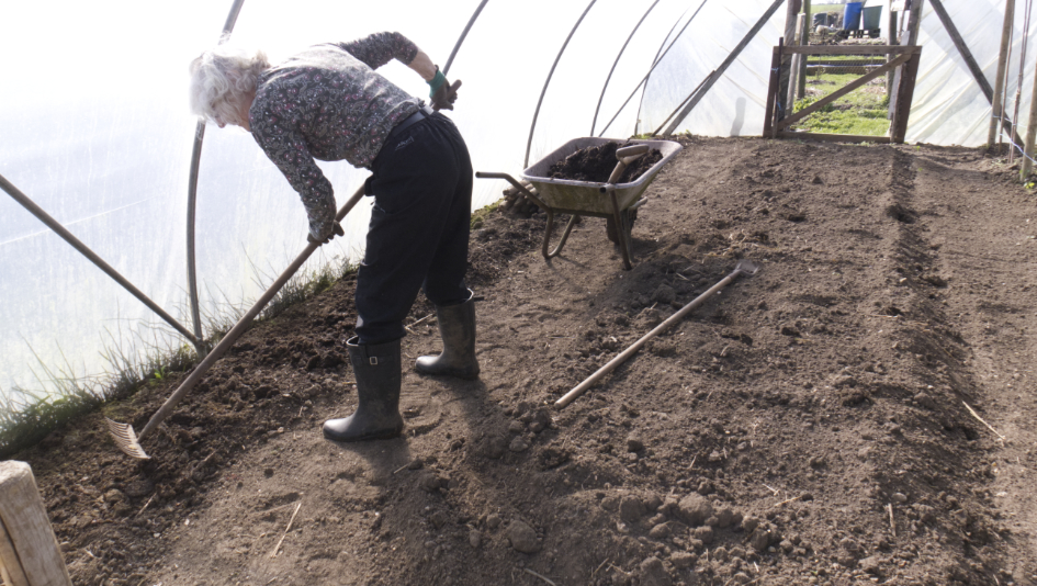 Dead leaves are continually removed. For this year’s harvest, some seeds are being sown direct, while others sown at home, are transplanted; here broad beans into a polytunnel for an early crop.