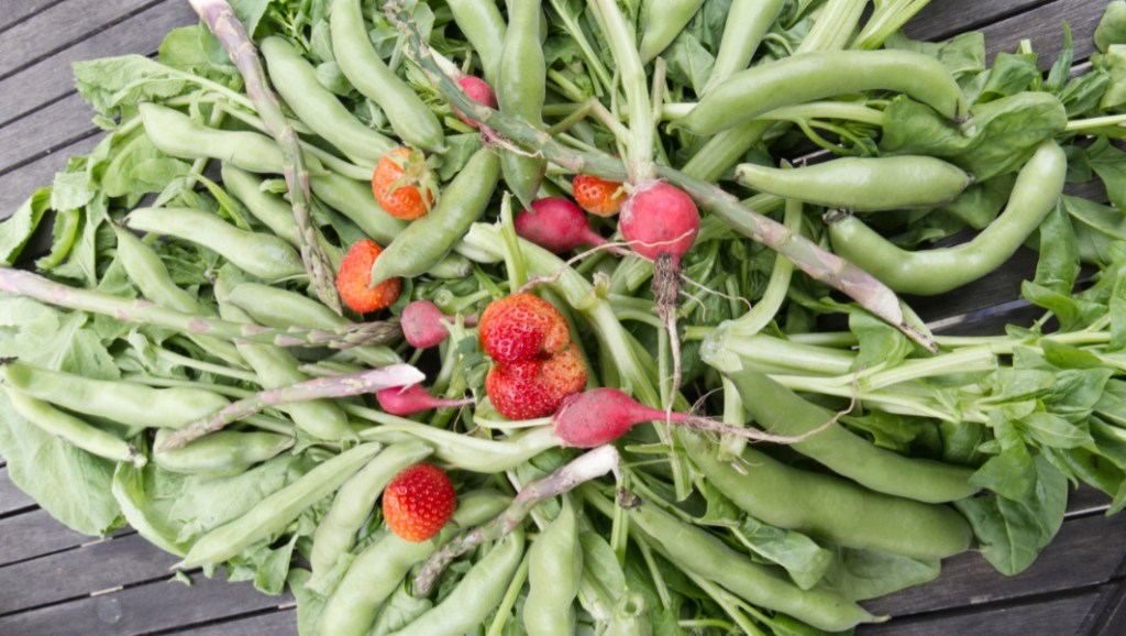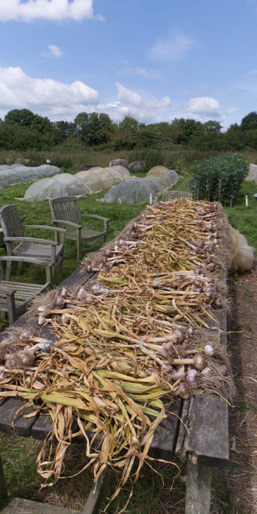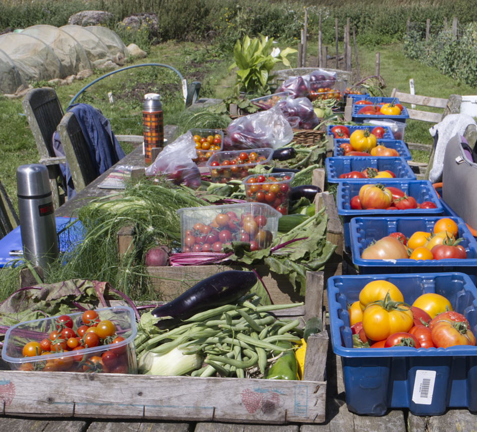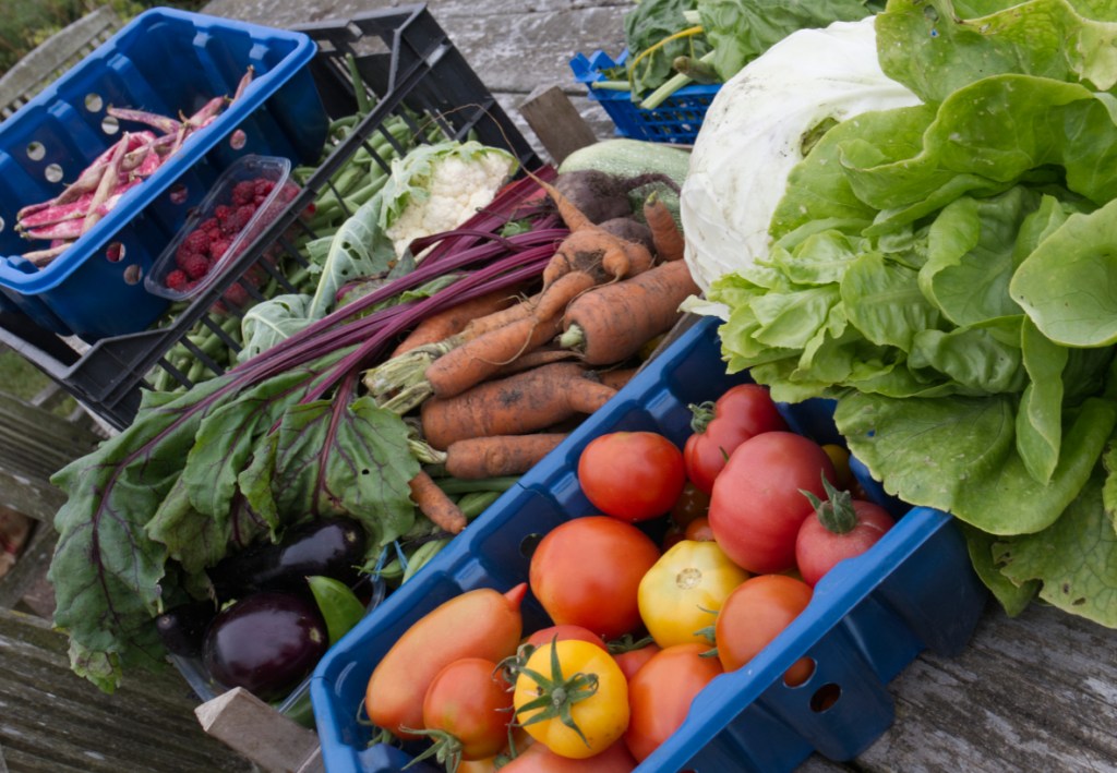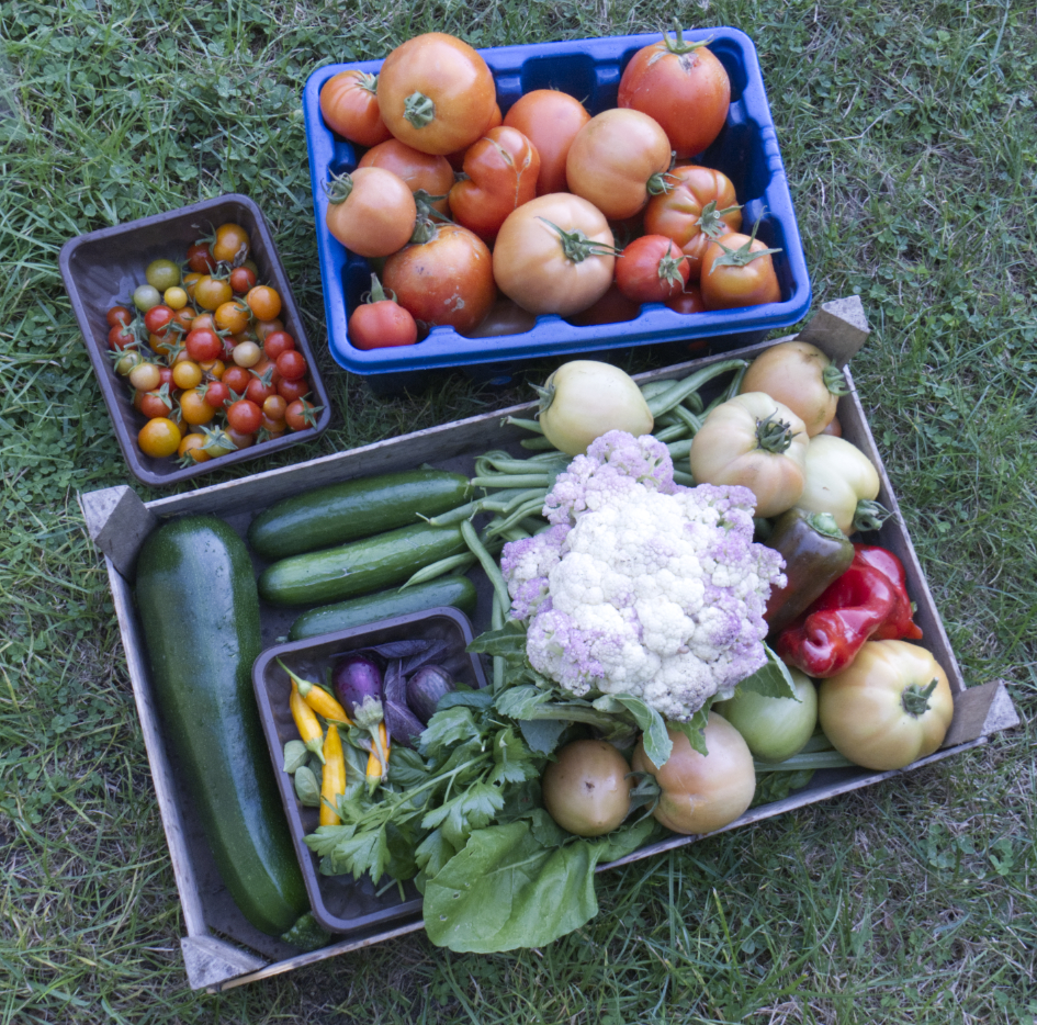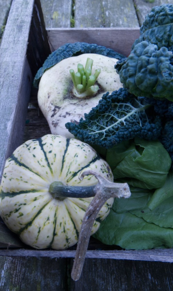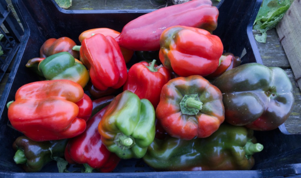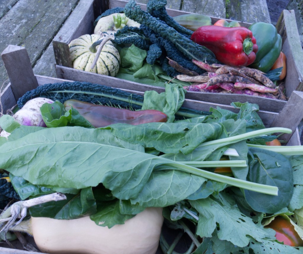 Harvested veg – turnips, sweetcorn, spinach, peppers (sweet and chilli), kale, tomatoes, squash (butternut, uchiki kuri, etc), cucumbers and green beans.