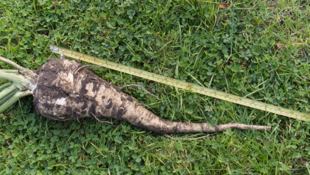 A successful morning’s work and even if we had a slow start last spring, with many seeds not germinating or being eaten while young seedlings, two parsnips did grow, one being dug up today, length 48cm.