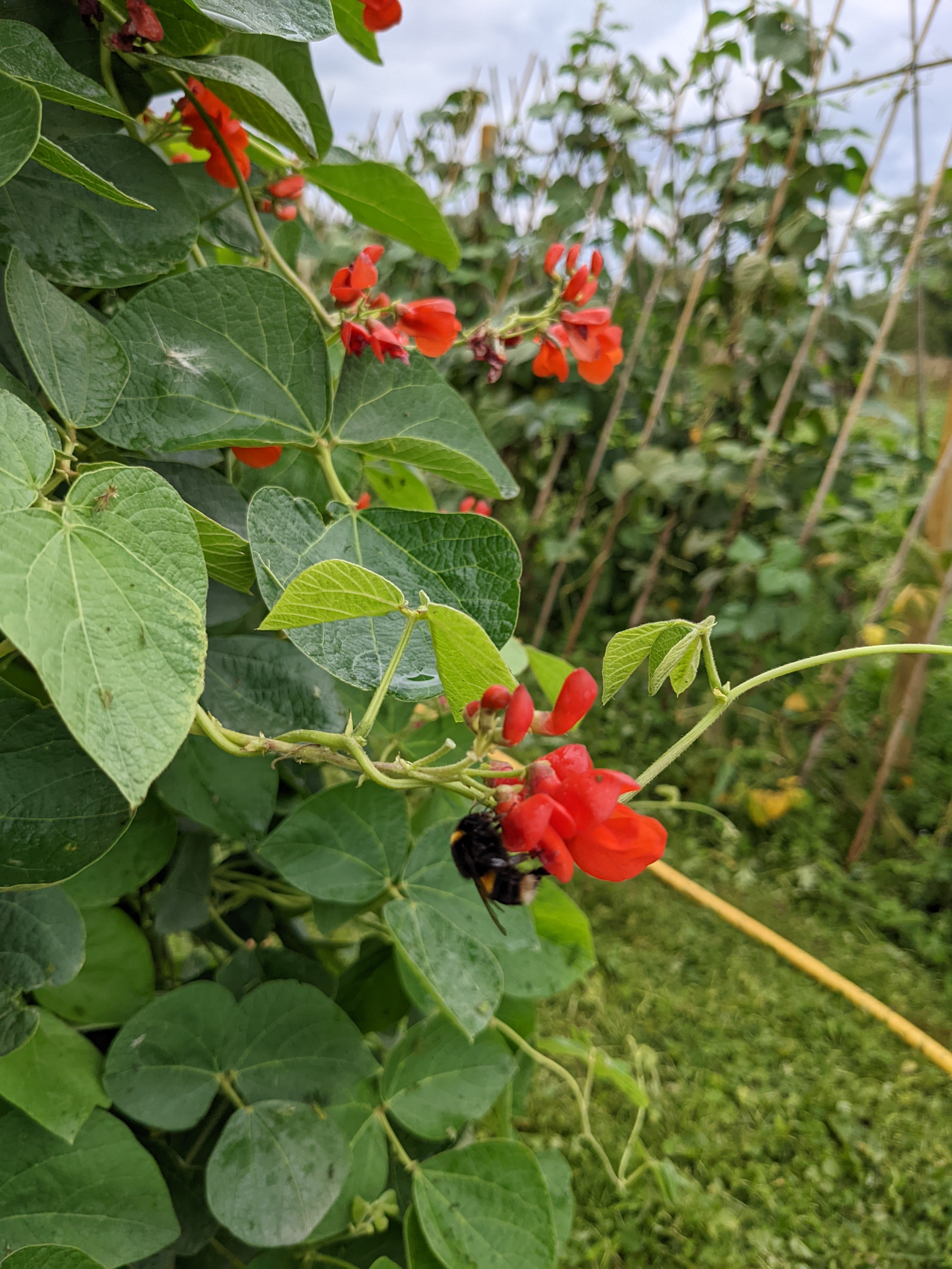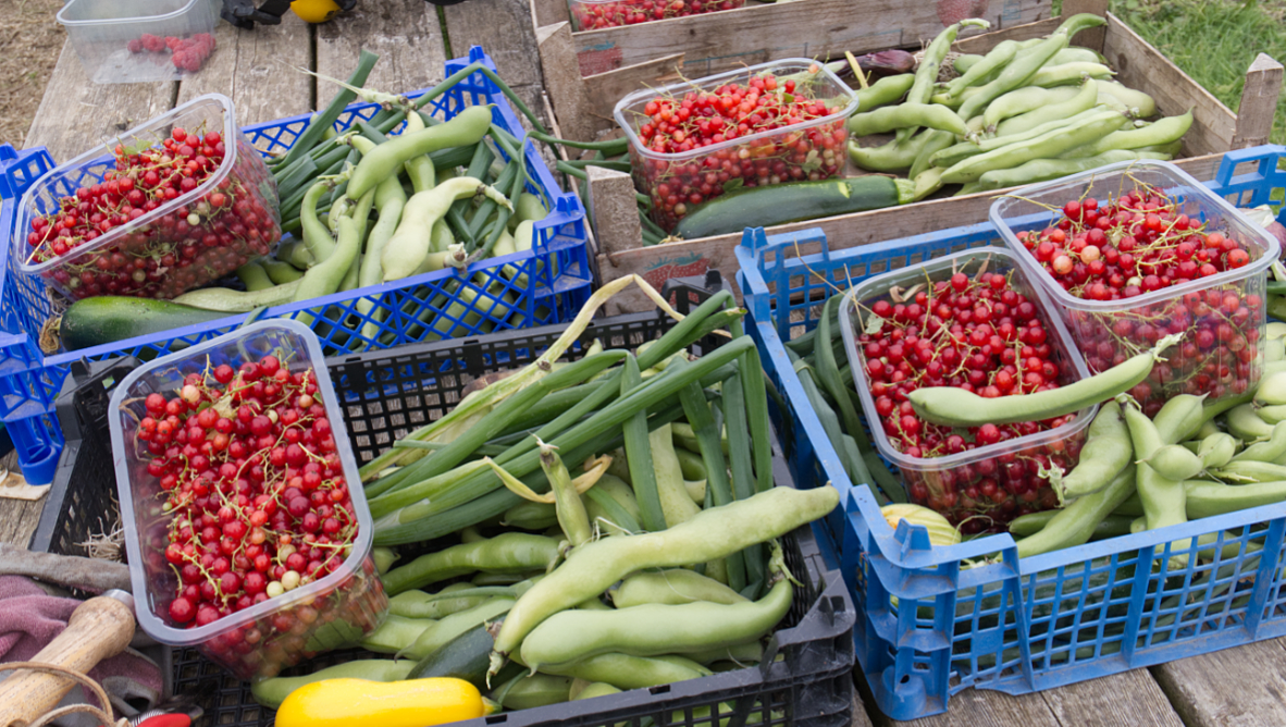 The red currant bushes are thriving, as are broad beans and now courgettes are being added to our take-home boxes.