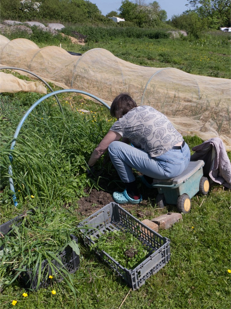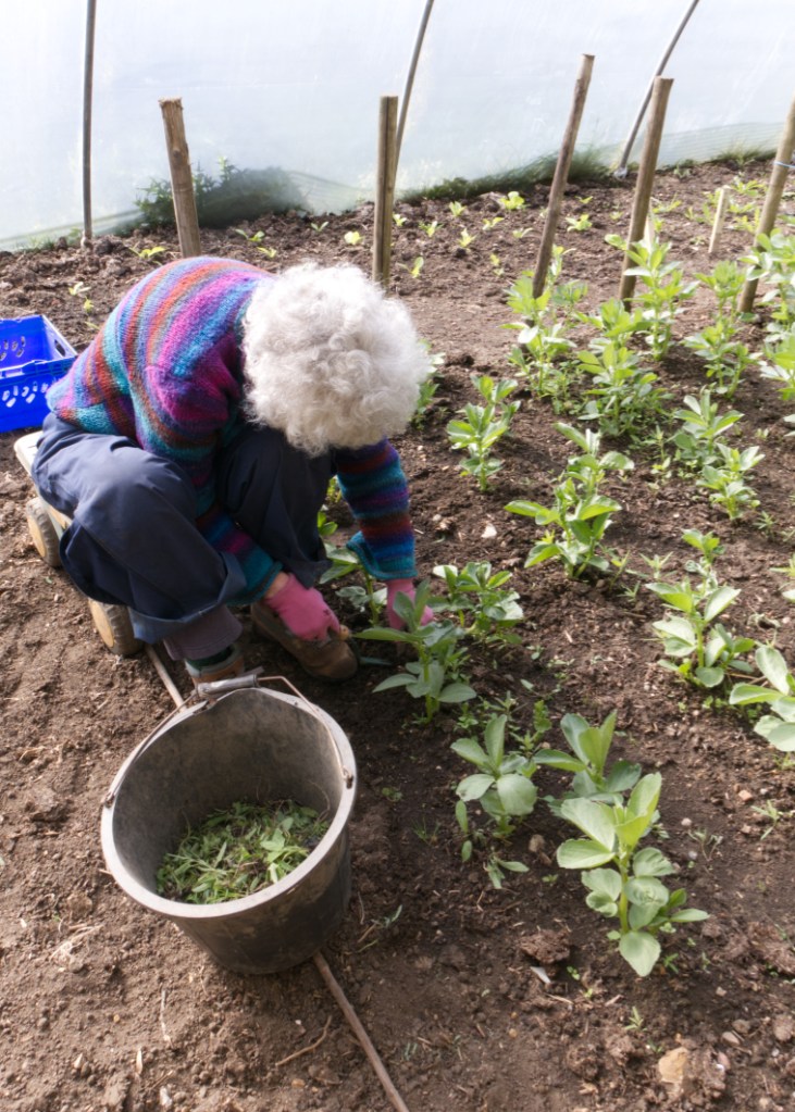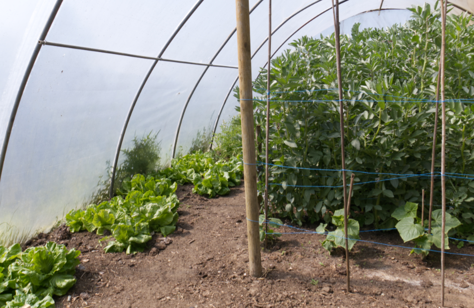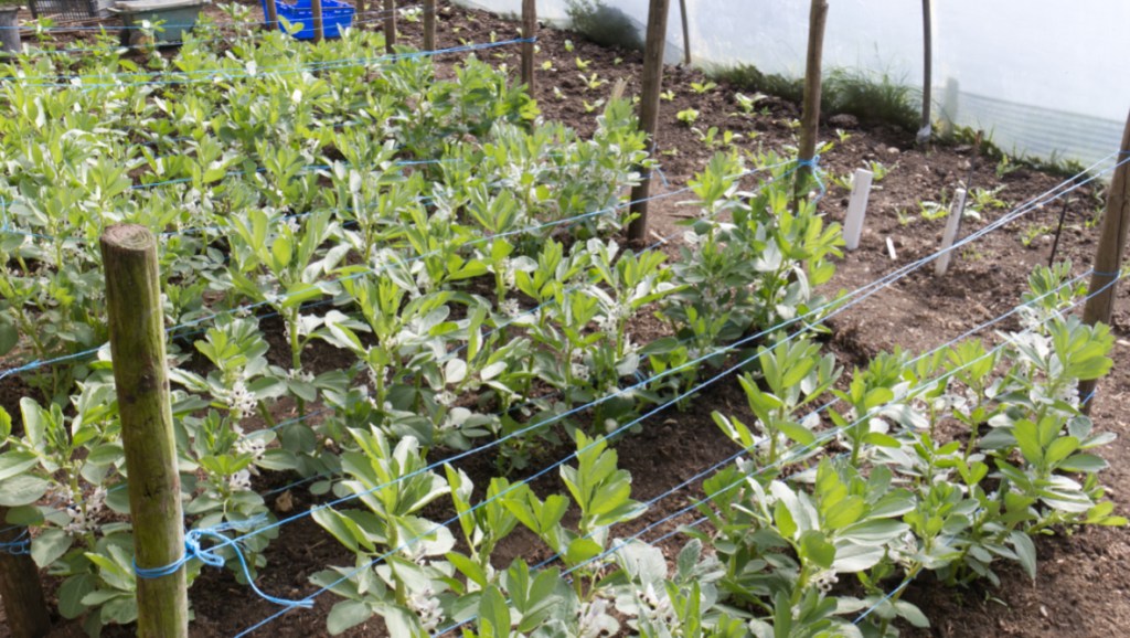 In one poly, parsley has overwintered, although now starting to go to seed; eggshells are being used to try and protect young cabbage plants from slugs and snails; broad beans are in flower, while lettuce, rocket and spinach seedlings are showing signs of progress.