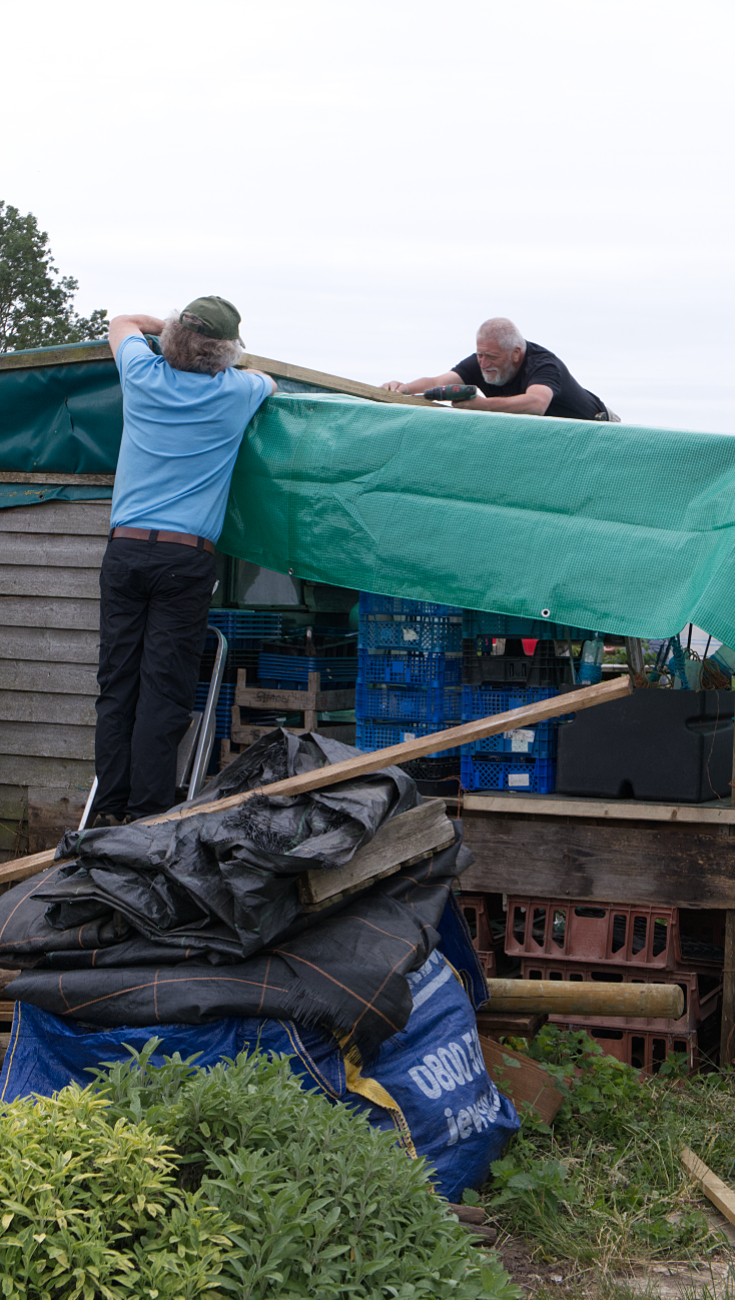 A big hurrah. A job that’s been waiting to be tackled for a long time has been completed (other tasks had obviously taken precedence). A new tarpaulin has replaced a rather leaky cover on the shed awning.