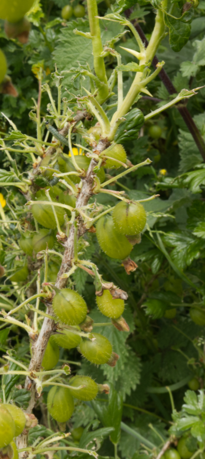 There have been a few hiccups; gooseberry sawfly larvae have gorged themselves on some leaves on a gooseberry bush but hopefully they were picked off in time for the fruit to continue growing (see photos), blackfly has appeared on some of the broad bean tops, in spite of having been covered with netting and the Pink Fir Apple potatoes have had to be burnt as they had succumbed to potato blight.